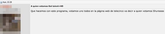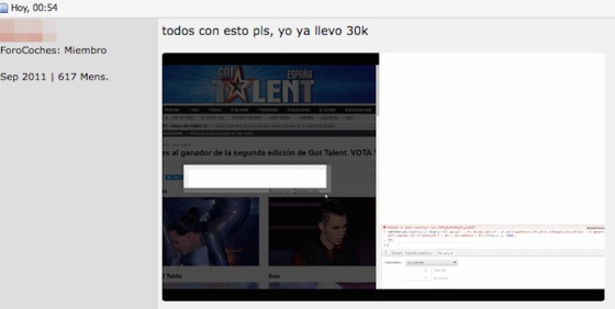 Pocos minutos después de que comenzara la final del programa de Mediaset, cerca de las diez y media de la noche, un usuario de Forocohes abrió un hilo que preguntaba a qué concursante deberían votar en masa de entre los finalistas de Got Talent. "Al Tekila, para reírnos de Risto Mejide", contestaba otro apenas unos segundos después. (Se puede pinchar para ampliar la imagen de los mensajes).