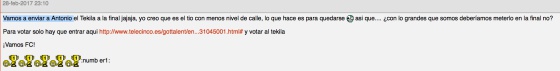 "+1 si has colaborado en la victoria de El Tekila", se titula un hilo de Forocoches abierto poco después de anunciarse el ganador de la segunda edición de Got Talent en Telecinco. Este +1 es un equivalente al "me gusta" en las redes sociales.