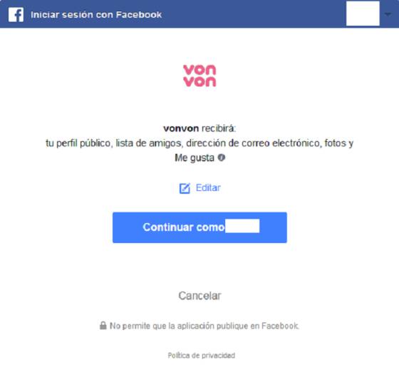 Para jugar, Vonvon pide dar clic en el botón Conectarse para ver el resultado. Al hacer esto aparece una ventana que indica que al acceder al juego, la compañía recibirá la información de tu perfil público (incluye nombre, foto de perfil, edad, sexo, idioma, país y otra información que hayas hecho pública), lista de amigos, dirección de correo electrónico, fotos y Me gusta. Una vez que aceptas estas condiciones, la app carga tus fotos de perfil en tu cuenta de Facebook y te pide elegir una para encontrar tu supuesta similitud con alguna celebridad.