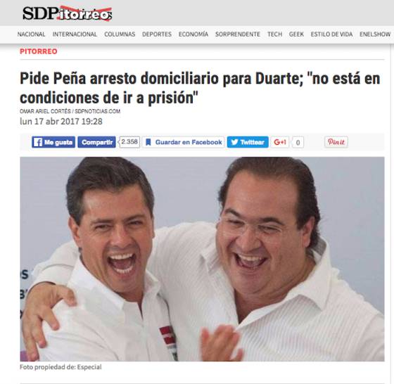 El caso judicial de Javier Duarte aún está lejos de una resolución. A unos días de su arresto en Guatemala, aún está pendiente su extradición a México, al igual que su proceso en los tribunales por cargos de fraude y malversación de fondos públicos. Una noticia publicada este lunes ha causado indignación entre los mexicanos en Facebook y Twitter. Esta lleva el titular “Pide Peña arresto domiciliario a Duarte; no está en condiciones de ir a prisión”. Se trata de una broma de la sección humorística de SDP Noticias, SDPitorreo. Sus editores lo han aclarado en una nota publicada este miércoles.