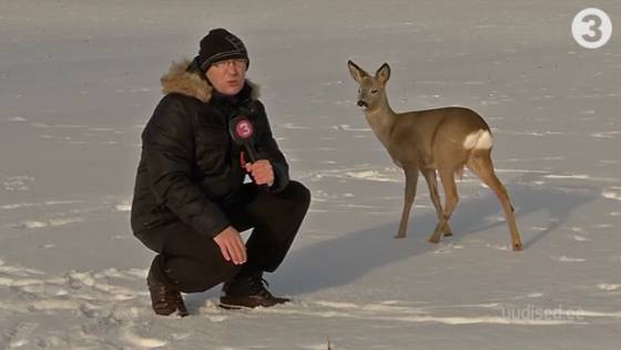La imagen viene de una cadena de televisión de Estonia, que dedicó una historia a un ciervo que se hizo amigo de un perro en febrero de este año. El reportero se acercó al ciervo, que parecía simpaticote, pero aun así no estaba por la labor de responder a sus preguntas.