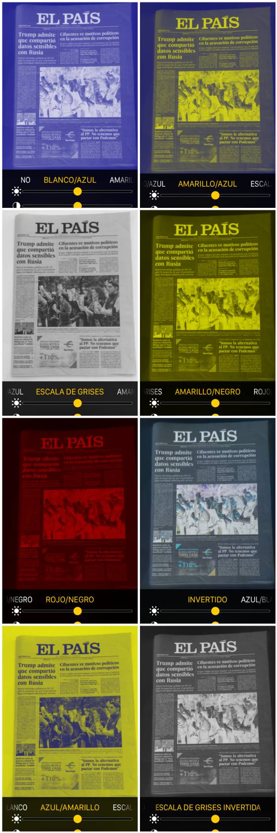 Además, puedes aplicar diferentes filtros de colores para leer la imagen con las tonalidades que mejor favorezcan tu lectura. Estas son algunas de las opciones. Para acceder a ellas, pincha en los botones situados junto al gris principal.