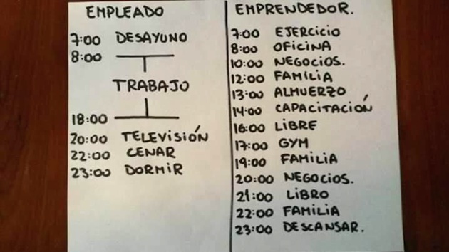 (Es posible que nuestros lectores hayan visto esta imagen en la que se compara el horario de un empleado con el de un emprendedor, muy comentada en Linkedin y en Twitter. En Verne hemos tenido acceso al diario completo de este emprendedor, que reproducimos por su interés y que aseguramos que es absolutamente verídico. Es todo cierto. Jamás nos inventaríamos algo así. Nunca. La duda ofende).