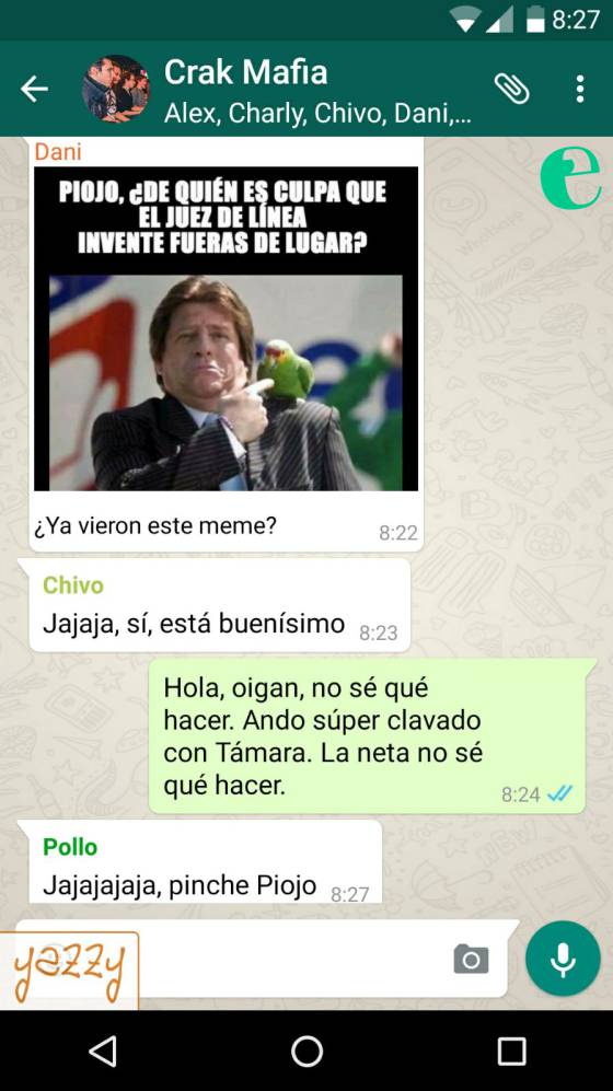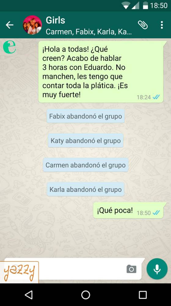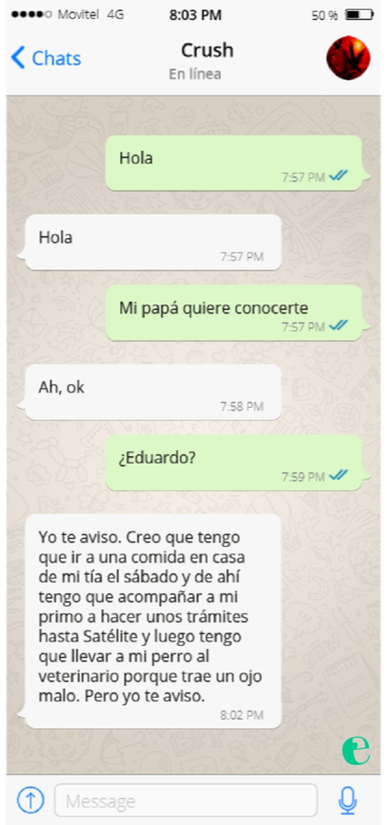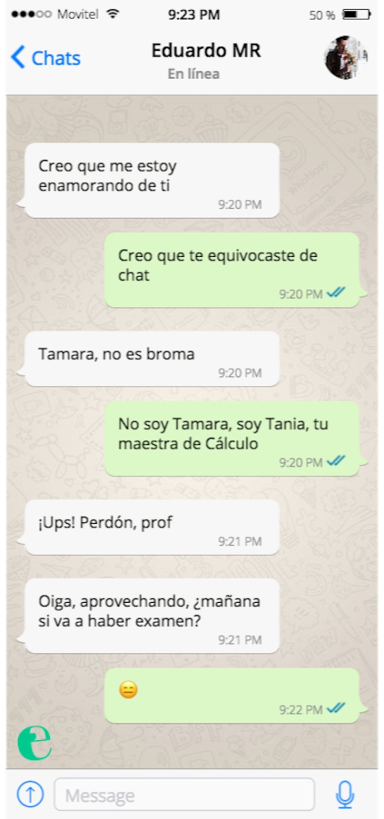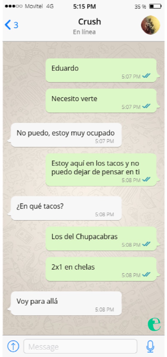 Flor Carrillo, una estudiante mexicana de 18 años, conquistó a cientos de miles de usuarios en Facebook con una novela romántica conformada por conversaciones simuladas de WhatsApp. Mucha gente creía que la trágica historia entre los universitarios Tamara y Eduardo era real, pero la compleja trama salió de la mente de la joven durante una noche de insomnio. La historia titulada ¿Quieres ir por un café? nos ha inspirado a imaginar otras conversaciones entre los protagonistas y sus amigos que no tienen nada de románticas, pero son muy realistas.