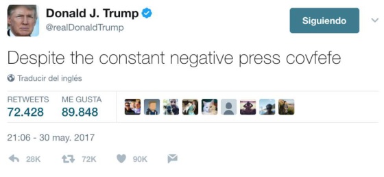 “A pesar de la constante prensa negativa covfefe”, decía el mensaje, que el presidente de Estados Unidos ha borrado posteriormente. Probablemente, quería decir "coverage" (cobertura) para hablar de la negativa cobertura de la prensa. El tuit ha alcanzado en muy pocas horas los 72.000 retuits y los 90.000 "me gusta", antes de desaparecer.