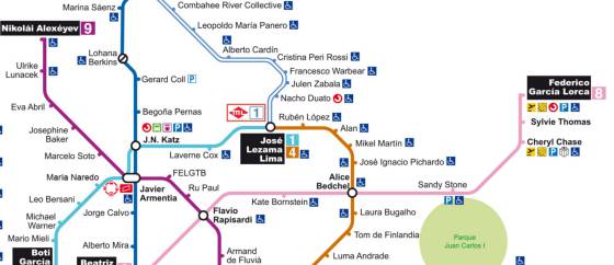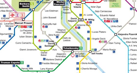 En su obra, Príncipe Pío es Chavela Vargas, Plaza Elíptica es Tchaikovsky, La Peseta es Harvey Milk, El Casar es Jodie Foster, Pacífico es Alejandra Pizarnik, Príncipe de Vergara es Carla Antonelli, La Almudena es Pedro Almodóvar, La T4 es Federico García Lorca, Arganda del Rey es Oscar Wilde, Lago es Pedro Zerolo, La Fortuna es Truman Caporte, Moncloa es Eduardo Mendicutti, Nueva Numancia es Ellen DeGeneres...
