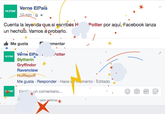 La saga de libros de Harry Potter cumple este 26 de junio 20 años, y en Facebook han querido celebrarlo con magia: los desarrolladores han incorporado una animación en la que una varita lanza rayos de colores y estrellas, que se activa cuando los usuarios escriben "Harry Potter" o el nombre de alguna de las casas de Hogwarts –los equipos en los que se divide el colegio de magos– en una publicación o en los comentarios.
