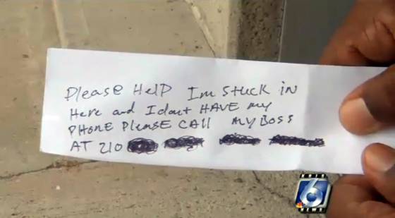 Afortunadamente, el trabajador llevaba un bolígrafo encima para escribir dichas notas. Según el portavoz de la policía, los que leyeron sus mensajes se lo tomaron a broma, hasta que un usuario del cajero sí hizo caso al siguiente texto: "Por favor, ayuda. Estoy atrapado aquí dentro y no llevo el teléfono. Por favor, llamad a mi jefe al 210 ...".
