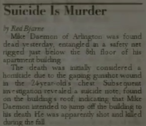 El 23 de marzo de 1994 el médico forense examinó el cuerpo de Ronald Opus y concluyó que murió de una herida de bala en la cabeza. El señor Opus había saltado desde lo alto de un edificio de diez pisos con la intención de suicidarse. Dejó una nota antes de lanzarse al vacío, en la que indicaba sus razones. Durante la caída y pasando el noveno piso su vida se vio interrumpida por un disparo de escopeta que paso a través de una ventana y lo mató instantáneamente.