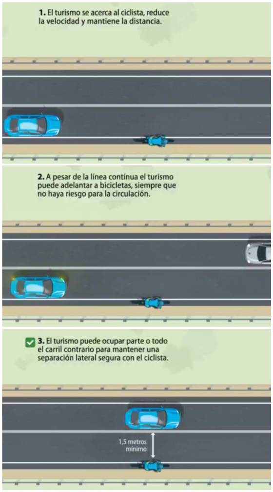 La técnica holandesa para abrir el coche no es la única recomendación en favor de los ciclistas que la Guardia Civil ha difundido en las últimas semanas. Las recientes muertes de ciclistas en carretera son otro problema que exige concienciación por parte de los conductores. Como explican a continuación, hay que dejar un metro y medio de distancia al adelantar a los ciclistas. En este artículo te contamos cómo circular con ciclistas en carretera con más detalles.