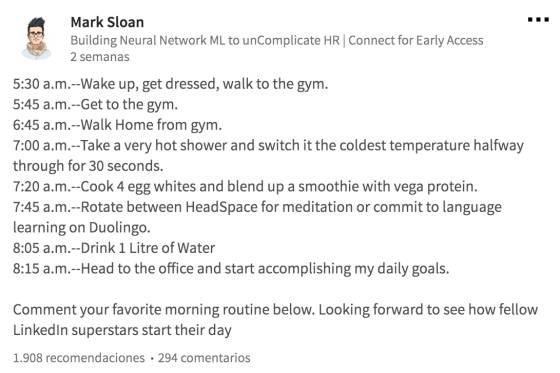 El canadiense Mark Sloan es el fundador de una empresa que se dedica a ayudar a "estrellas de las finanzas" en su búsqueda de empleo. Usuario activo en LinkedIn, donde acumula 20.000 seguidores, ha compartido un texto en esta red social para profesionales detallando su rutina matutina. Cansa solo leerla. Debajo del pantallazo está la traducción en castellano.