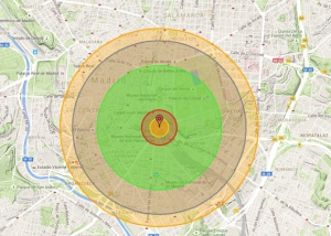La herramienta de Wellerstein utiliza distintos colores para diferenciar el radio de alcance de la explosión y explica los efectos que ocasionarían a la población. Son, de dentro a fuera:
