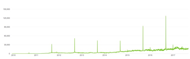 Cada vez que alguien pronuncia o escribe 7 de septiembre, es muy probable que surja la coletilla "Es nuestro aniversaaaario" por parte del gracioso de turno en un grupo de WhatsApp o en la oficina (en la mía soy yo). En YouTube, la relación con esta fecha del calendario y el tema de Mecano es igual de intensa. Así lo muestra este gráfico que registra las visualizaciones del vídeo promocional del tema, lanzado en 1991 como primer sencillo del disco Aidalai. La tradición de escuchar la canción en este momento del año sobrevive a los cambios generacionales y a la llegada de nuevos formatos audiovisuales. Mecano es, a 7 de septiembre de 2017, trending topic entre los tuiteros españoles.