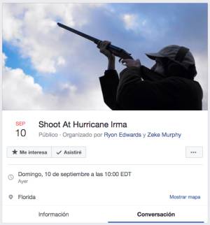 Esta advertencia del sheriff era una respuesta a un evento de Facebook llamado Shoot at Hurrican Irma (“disparad al huracán Irma”), creado este domingo. Se interesaron por el evento unas 55.000 personas y otras 29.000 han publicado que han asistido. Este evento era una broma y muchos se lo tomaron así, llegando a publicar fotos suyas con armas. Alguno publicó un gráfico que explicaba dónde apuntar para que las balas no volvieran atrás y otros preguntaban si no sería contraproducente: “¿No se enfadará más?”.
