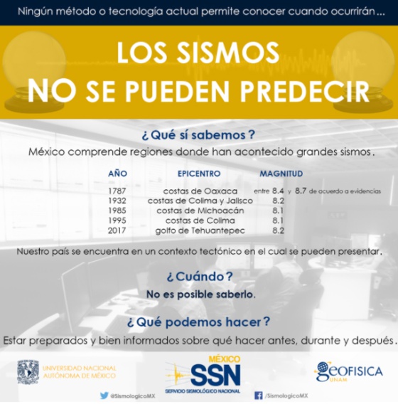 Víctor Manuel Cruz Atienza, jefe del Departamento de Sismología del Instituto de Geofísica (IGf) de México, explicó por aquel entonces en una nota de prensa que este tipo de informaciones "debe ignorarse, pues no es posible predecir los sismos. La población debe referirse a fuentes oficiales y especializadas, como es la página de Internet del Instituto Sismológico Nacional (SSN)". Actualmente, al entrar en la página del SSN, aparece el siguiente aviso: