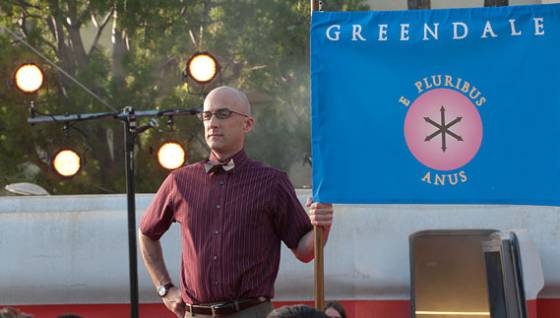 5. La bandera de la escuela universitaria de Greendale. La bandera aparece en el cuarto episodio de la segunda temporada de la serie Community. Tiene el lema “e pluribus anus” y fue el diseño presentado por el grupo de estudiantes protagonista de la serie. Es un símbolo del esfuerzo de estos estudiantes por aprender y salir al mundo en todas las direcciones para convertirlo en un sitio mejor.