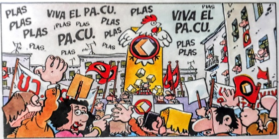 6. Una bandera con el logo del Pa.Cu. El Pa. Cu. es el Partido Cuadrado, que aparecía en Los cabecicubos, una de las aventuras de Superlópez. En esta obra de Jan, unos huevos contaminados provocan que a algunas personas se les ponga la cabeza cuadrada. Al principio se les margina, pero poco después fundan este partido y ganan las elecciones. Triunfan gracias a su programa de orden, a su lema “cuadremos el país” y a su campaña para fomentar el miedo a la “amenaza cabecirredonda”.