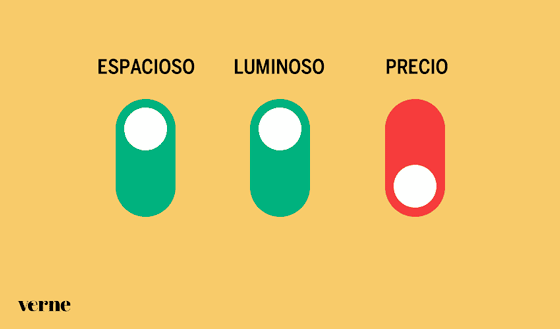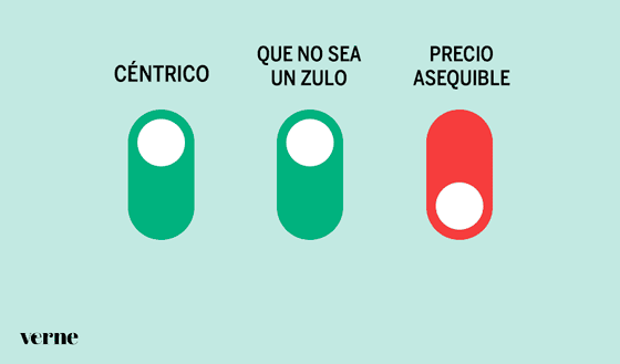 Como a casi todos nos ha pasado algo así, (¡cuéntale a Laura tu experiencia en mejorver@verne.es!), estos interruptores resumen bien la problemática. O te conformas con perder uno de los requisitos… o no te queda otra que seguir intentando dar con la casa de tus sueños, cueste el tiempo que cueste.