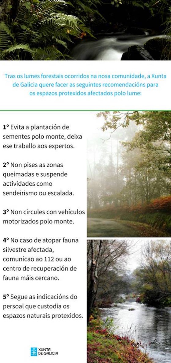 Tras los incendios forestales ocurridos en nuestra comunidad, la Xunta de Galicia quiere hacer las siguientes recomendaciones para los espacios protegidos afectados por el fuego.
