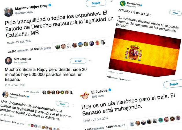 En España, 10 de los 11 mensajes que más se habían retuiteado tres horas después de la aprobación de la Declaración Unilateral de Independencia (DUI) abordaban este tema desde distintos puntos de vista, desde mensajes institucionales a tuits de humor. El otro era sobre fútbol.