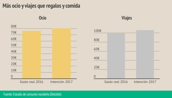 Si seguimos analizando en qué vamos a gastar el dinero estos días, encontramos que en 2017 las partidas que más aumentarán respecto a hace un año son el ocio y los viajes. En 2016 se gastaron en cada hogar 76 euros en ocio y la intención este año es que aumente hasta 80 (5,3% más). Del mismo modo, según Deloitte, hace un años se gastó en viajes 99 euros y la intención para estos días es de 106 euros (7%).