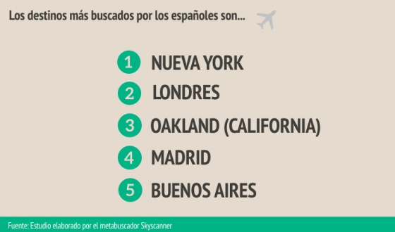 Aunque los destinos estrella no suelen variar mucho, con Nueva York, Londres y Madrid a la cabeza, en 2017 existen tendencias novedosas debido a la apertura de nuevas líneas. Según Skyscanner, Oakland (en la bahía de San Francisco) y Buenos Aires serán destinos claves para los viajeros españoles durante estos días.