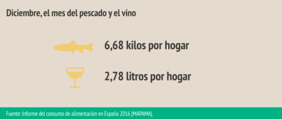 ¿Compramos en diciembre productos parecidos al resto del año? ¡No! El pescado llega este mes a facturaciones que incluso son un 50% superiores al resto de meses. Cada hogar español consume casi 7 kilos de pescado en diciembre, mientras que la media del año apenas supera los 5. También en el vino se ve un incremento elevado: la media anual es de 1,5 litros al mes y en diciembre ascendió hasta casi los 3 litros. Sin embargo, diciembre no es el mes favorito de los españoles para consumir hortalizas y fruta (no nos ha sorprendido a nadie).