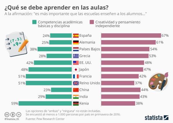 Cuando nos preguntan qué es lo más importante que los niños deben aprender en los colegios, el 64% de los españoles creemos que la creatividad y el pensamiento independiente deben tener más peso que las competencias básicas y la disciplina (24%).