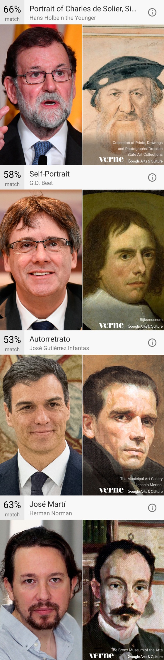 Como tampoco se puede descargar en España, lo hemos probado con personajes conocidos de nuestro país, de políticos a concursantes de OT, además de algún youtuber. Eso sí, no son propiamente selfis, sino que hemos tenido que hacer una foto a una foto, por lo que los resultados podrían variar en caso de que alguna de estas personas lo probara directamente con la cámara del móvil. Eso sí, muchos resultados sorprenden por lo acertados: Muguruza es clavada a su retrato, y a Pablo Iglesias le tenía que salir, justamente, el político y poeta cubano José Martí. Otros llaman la atención por lo contrario, claro.