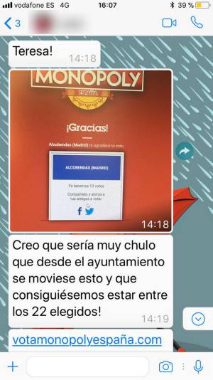 Antes de la publicación de Facebook del ayuntamiento, Alcobendas (113.000 habitantes) llevaba 17 votos. Este lunes supera los 60.000. Después de votar, la web de Monopoly da la opción de compartir el voto por redes sociales.