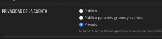 Esta red también permite cambiar la privacidad del perfil del usuario y de las actividades que este realiza, escogiendo entre cuatro niveles: "Solo yo" (nadie más puede acceder a la información), "mis conexiones" (solo los contactos), "mis conexiones y grupos" (solo contactos y grupos de entrenamiento) y "todo el mundo" (público).