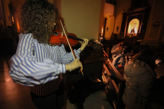 Durante esas dos horas en las que prácticamente toman el mando, más de un centenar de personas entran en la iglesia. Los móviles y las latas de cervezas no están prohibidos en el interior. Cerca del altar, siete miembros del grupo tocan música religiosa. Hay guitarras, una flauta, un cajón y un violín. Otros, en un gesto de devoción que se antoja exagerado, se arrodillan ante el retablo barroco que preside la estancia.