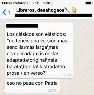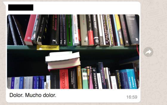 He de decir que, en dos ocasiones, dos clientes diferentes me enseñaron fotos del WhatsApp. BORRADAS. A ver si yo era capaz de discernir en el manchurrón de colores qué libro les había recomendado su primo el de Antequera.