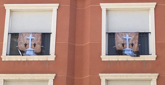 Callosa de Segura tenía una cruz franquista colocada, en 1942, en honor a 81 muertos vinculados al bando sublevado durante la Guerra Civil. Ahora, tiene decenas. Tras su polémica retirada el 29 de enero, que se saldó con la detención de dos personas vinculadas a Falange Española, los vecinos contrarios a la decisión del Ayuntamiento han comenzado un pulso con el alcalde. Este quita la cruz, ellos colocan réplicas en diferentes formatos. Agulló, que forma parte del grupo vecinal Plataforma en Defensa de la Cruz, la proyecta desde su balcón y también vende, a 15 euros, telas cubrebalcones con la imagen del monumento. “No sacamos dinero con ellos, es lo que nos cuesta hacerlas”, asegura.