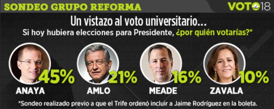 El diario mexicano Reforma publicó un sondeo este martes que hizo a universitarios de escuelas públicas y privadas de la Ciudad de México, Monterrey y Guadalajara rumbo a las elecciones del 1 de julio. Este ejercicio ubica al candidato de Morena, Andrés Manuel López Obrador, en el segundo lugar de las preferencias por debajo del candidato del Frente, Ricardo Anaya Cortés. De acuerdo con la publicación, el político tabasqueño cuenta con el 21% de la preferencia de los estudiantes, mientras que el queretano obtuvo el 45%.
