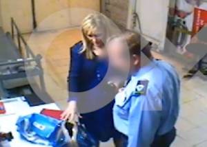 No sé si se ve claramente, pero cuando el segurata del Eroski le pide que vacíe el bolso, a Cifuentes se le cae el trabajo de fin de máster al suelo.