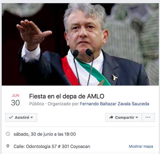 Un evento en redes se ha popularizado desde hace unos días: 'Fiesta en el depa de AMLO' se ha convertido en la nueva convocatoria anónima que triunfa en Facebook con más de 109.000 personas interesadas en pocos días y casi 50.000 que han confirmado su asistencia.