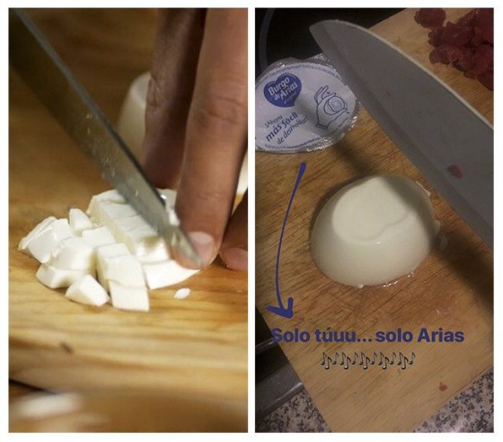 ¿Te duele ya la mano de cortar? Tranquilo, ahora vamos con el queso fresco, es tan blandito que apenas va a costar, de hecho debemos tener cuidado para no deshacerlo, tiene que quedar en forma de dados.
