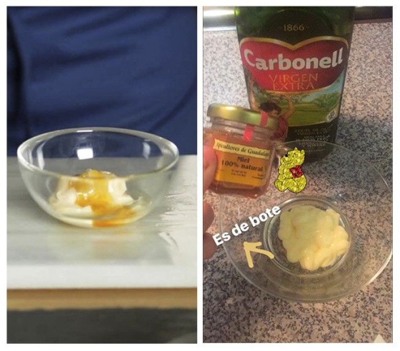 Ahora que ya tenemos todo cortado, podemos dejar el cuchillo: toca hacer una salsa que le dará un punto muy sabroso y, a la vez, aportará algo de estilo al plato… Cogemos mayonesa (casera o comprada) y añadimos un poco de miel de la Alcarria de Guadalajara, de las más ricas de España. Cuando hayas conseguido despegar la miel de la cuchara y que se mezcle con la mayonesa (si lo haces sin meter el dedo, no dudes en contarnos cómo), muévelo bien para que se unan.