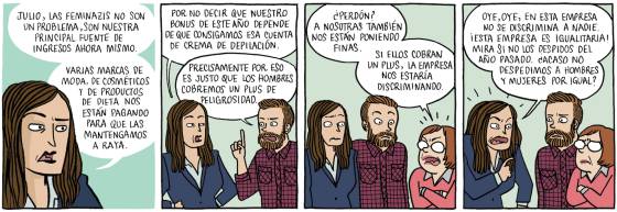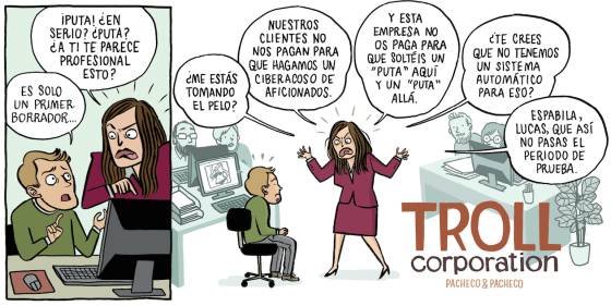 Este clima de ira casi constante no está presente solo en redes sociales: también en los comentarios de la prensa, que son parte de las responsabilidades de los empleados de Troll Corporation. Laura Pacheco apunta que “se puede saber qué comentarios te vas a encontrar en cada artículo”, según el tema y el medio. “Muchos tienden a repetir lo que ya han leído en otras partes”. Eso incluye términos de los que también se habla en las historietas, como el igualismo (“ni machismo ni feminismo”) y el buenismo (“¿llamar a una ambulancia? ¿Con lo caro que está el roaming? ¡Déjate de buenismos!”).