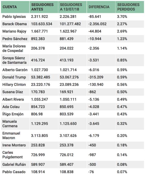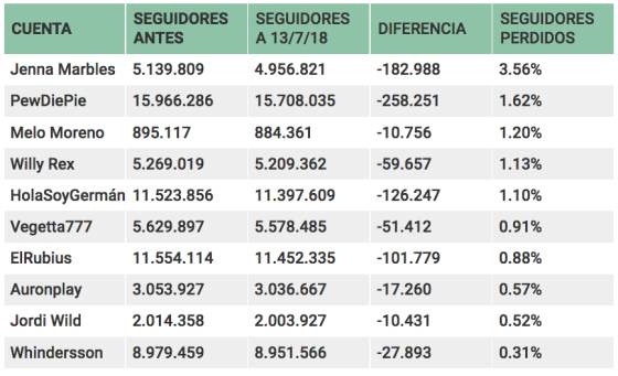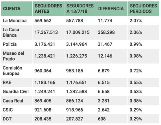 La cifra de seguidores anterior a la medida de Twitter procede de la herramienta de análisis de estadísticas en redes sociales Socialblade. La cantidad de seguidores posterior ha sido comprobada en Twitter entre las 9 y las 11:30 horas de este viernes 13 de julio.