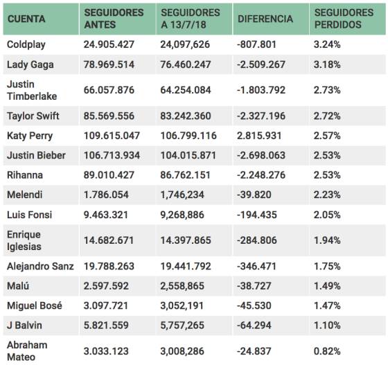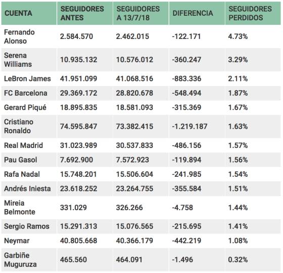 Twitter calcula que cada usuario perderá una media de cuatro seguidores. Los que acumulan decenas de miles o millones de seguidores están perdiendo muchos más. Hemos comprobado cuántos seguidores han perdido Pedro Sánchez, Katy Perry, ElRubius, Serena Williams, Alejandro Sanz o Policía desde que Twitter ha empezado a limpiar seguidores. Verne y EL PAÍS también han perdido seguidores.