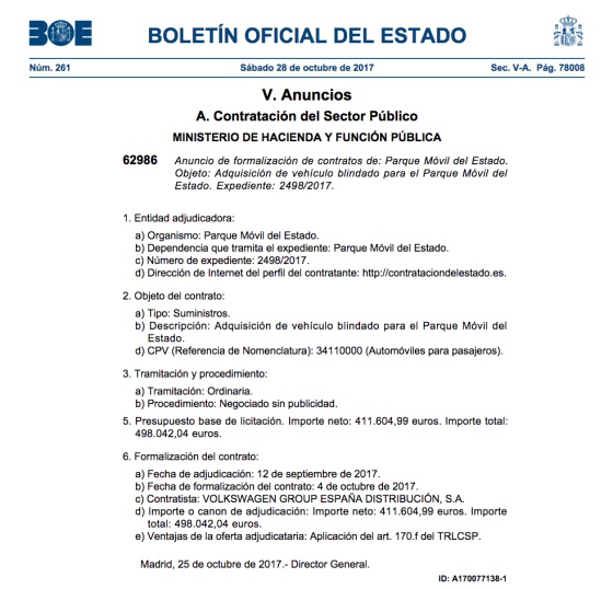 Tal y como informaba entonces ABC, este vehículo se compró en el 14 de septiembre del año 2017. Lo estuvo usando Mariano Rajoy hasta la moción de censura que concluyó el 1 de junio. El Boletín Oficial del Estado anunciaba la adquisición del coche blindado el 28 de octubre de 2017.