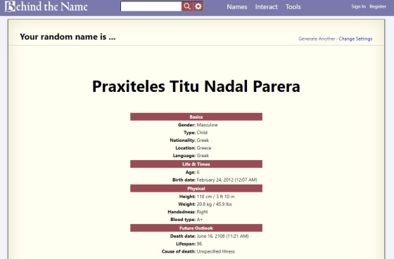 En un mundo donde ya hay de todo, hay incluso una herramienta automática que te ayuda a dar nombre a alguien. Se trata de la absurda y adictiva aplicación Behind The Name, que permite generar nombres (masculinos o femeninos) asociándolos a unos apellidos concretos y buscándole incluso una historia de vida completa. Cuando pedimos que le busque un nombre nuevo a Rafael Nadal nos sugiere Praxiteles Titu Nadal, nombre y apellidos que a la aplicación le parecen propios de un niño griego de 8 años. Hasta que crezca y sin saber su condición para el deporte, nos quedamos con nuestro gran Rafa.