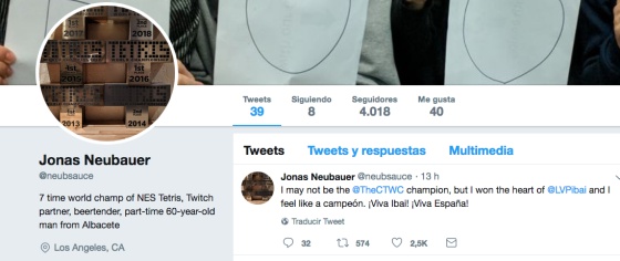 Estas noticias han llegado al propio Neubauer: el 24 de octubre, el jugador de Tetris publicaba un mensaje en su cuenta de Twitter que decía: "Me he despertado para descubrir que tengo 60 años y soy de Albacete, según todos en España. Me gusta".