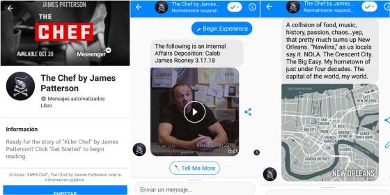 Para leer la novela, basta con abrir la aplicación y buscar en los contactos “The Chef by James Patterson”. Al iniciar una conversación, arranca el libro. Para ir avanzando en la historia, que también incluye vídeos, audios y fotografías, hay que ir tocando el emoji del cuchillo.