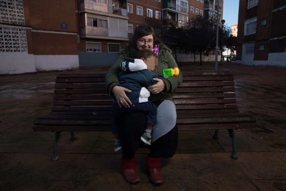 El hijo de Sara, de dos años, se ha levantado revuelto. Aunque la tripa lleva unos día que no le ha dejado en paz, esto no supone un impedimento para que el pequeño juegue con un carrito de juguete y se acerque a curiosear la bolsa en las que el fotógrafo guarda sus pertenencias.