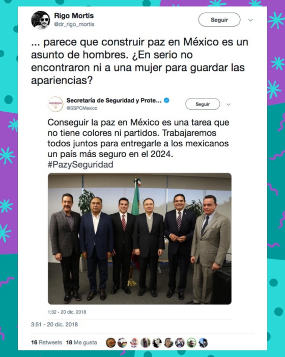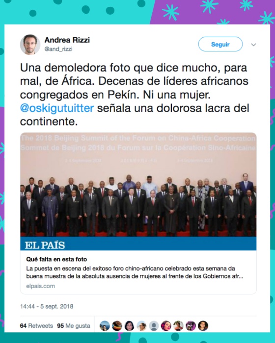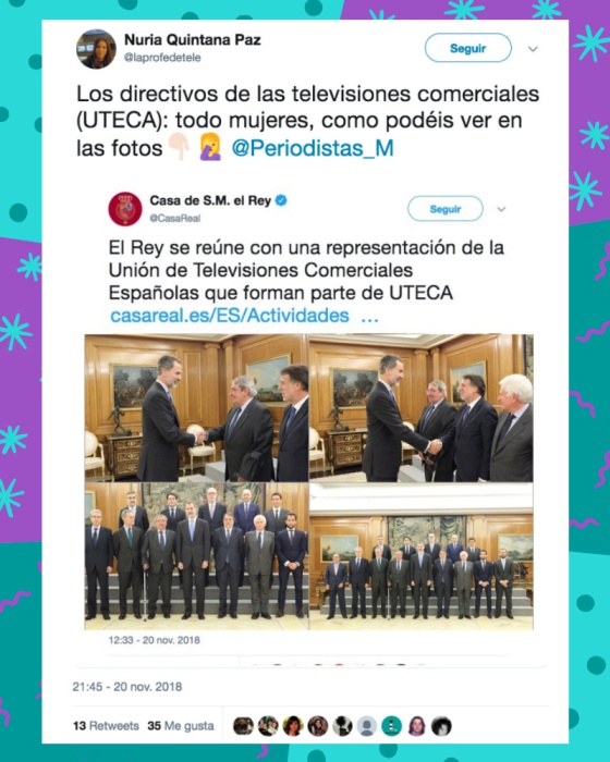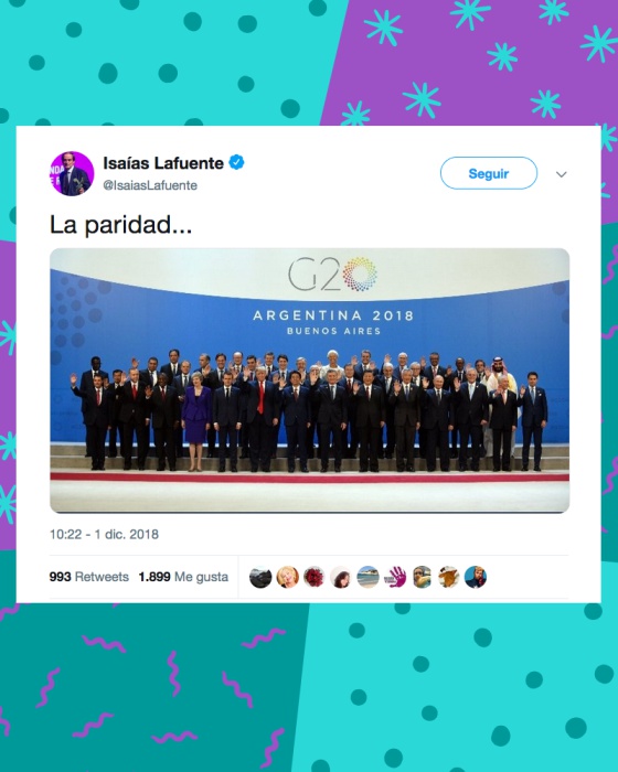 Era un paso importantísimo, pero muy lejos de la norma. Los grupos de señores encorbatados donde apenas aparecen tímidamente una o dos mujeres siguen siendo la imagen de las cumbres políticas y los consejos de administración. A partir de ese momento, empecé a guardar este tipo de imágenes, pensando en esta carta de fin de año. Twitter me ayudó mucho. Este 2018, las mujeres no hemos salido en estas fotos. Pero hemos protagonizado un precioso álbum: con pañuelos verdes para pedir la despenalización del aborto en Argentina. Con bufandas moradas, pancartas y megáfonos en las calles el 8 de marzo. Seguro que salís guapísimas al lado de vuestras compañeras de trabajo, amigas de toda la vida, madres, hijas, abuelas, hermanas y desconocidas.