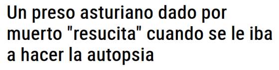 De este noticia, publicada el 8 de enero en La Nueva España, también se habló mucho en su día. El subtítulo de la noticia nos brinda un resumen rápido: "Dos médicos del centro y una forense certificaron el fallecimiento, pero ya en la morgue vieron cómo se movía y roncaba". El caso tuvo tanta trascendencia que incluso Instituciones Penitenciarias elaboró un nuevo protocolo médico para certificar el fallecimiento de reclusos en las cárceles españolas.