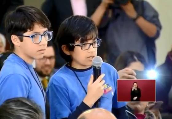 "A ver los dos niños. ¿Y ustedes, son reporteros?", dijo el presidente López Obrador. Fernando y Eitan se levantaron de sus lugares y tomaron la palabra para cuestionar al premier por las desapariciones en México. "En los últimos 12 años se ha incrementado muy alto el número de desapariciones de menores de edad. ¿Qué va a implementar su Gobierno para terminar con esto?", cuestionó Fernando Daniel.